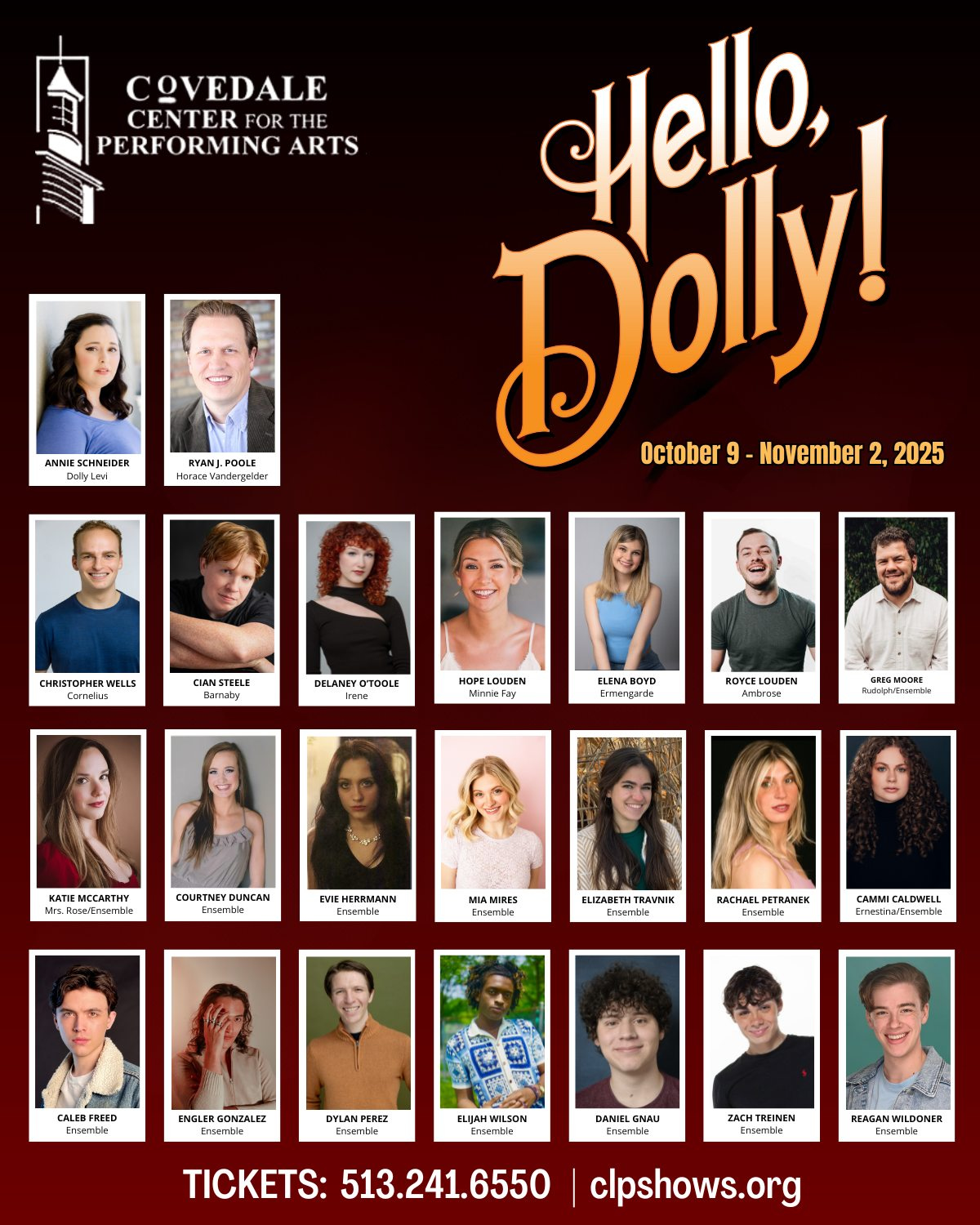 The Cast: Annie Schneider (Dolly Levi), Ryan J. Poole (Horace Vandergelder), Christopher Wells (Cornelius), Cian Steele (Barnaby), Delaney O’Toole (Irene), Hope Louden (Minnie Fay), Elena Boyd (Ermengarde), Royce Louden (Ambrose), Katie McCarthy (Ensemble/Mrs. Rose), Cammi Caudwell (Ernestina/Ensemble), Greg Moore (Rudolph/Ensemble), and the rest of the Ensemble includes Courtney Duncan, Evie Hermann, Elizabeth Travnik, Rachael Petranek, Mia Mires, Caleb Freed, Engler Gonzalez, Dylan Perez,