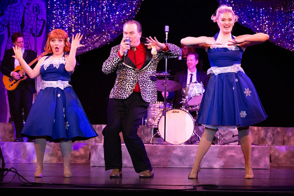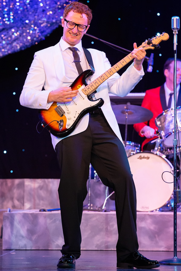 The Cast: Keaton Eckhoff (Buddy), Joe Memory (Joe Mauldin/Cricket (Bass), Brian Malone (Jerry Allison/Cricket (Drums), Evan Rogers (Cricket (Rhythm Guitar), Ryan J. Poole (Hipockets/Norman/Big Bopper, Jovanni Candia (Richie Valens), Jennie Malone (Vi Petty/Hayrider/Piano, Anyuli Martinez-Gomez (Maria Elena), Terris Bates (Apollo Performer/Dancer), Emmie Brewer (Dancer/Dance Captain), and dancers including Mia Mires, Zoe Bullock and Caleb Freed